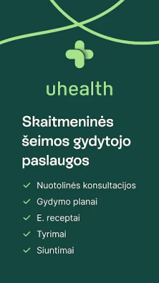 Platforma uhealth transformă modul în care interacționați cu medicii. Obțineți consultații video sau prin mesaje cu un medic de familie în cel mult 24 de ore – adesea chiar în două ore lucrătoare – inclusiv seara, în weekend sau de sărbători. Aveți acces la planuri de tratament personalizate, rețete electronice, trimiteri către specialiști și posibilitatea de a comanda și analiza rezultatele investigațiilor direct din aplicație. Mai mult, uhealth oferă acum și consultanță psihiatrică prin apel video, o inovație pentru bunăstarea dumneavoastră mentală. Toate serviciile sunt oferite de medicii clinicii Hila, lideri recunoscuți în domeniul medical din Lituania, cu o experiență de peste 30 de ani.